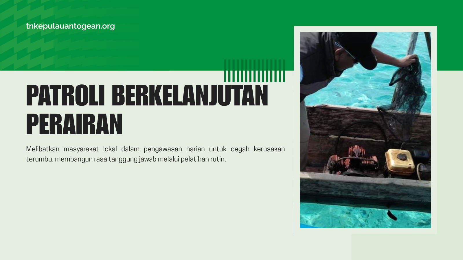 Melibatkan masyarakat lokal dalam pengawasan harian untuk cegah kerusakan terumbu, membangun rasa tanggung jawab melalui pelatihan rutin.