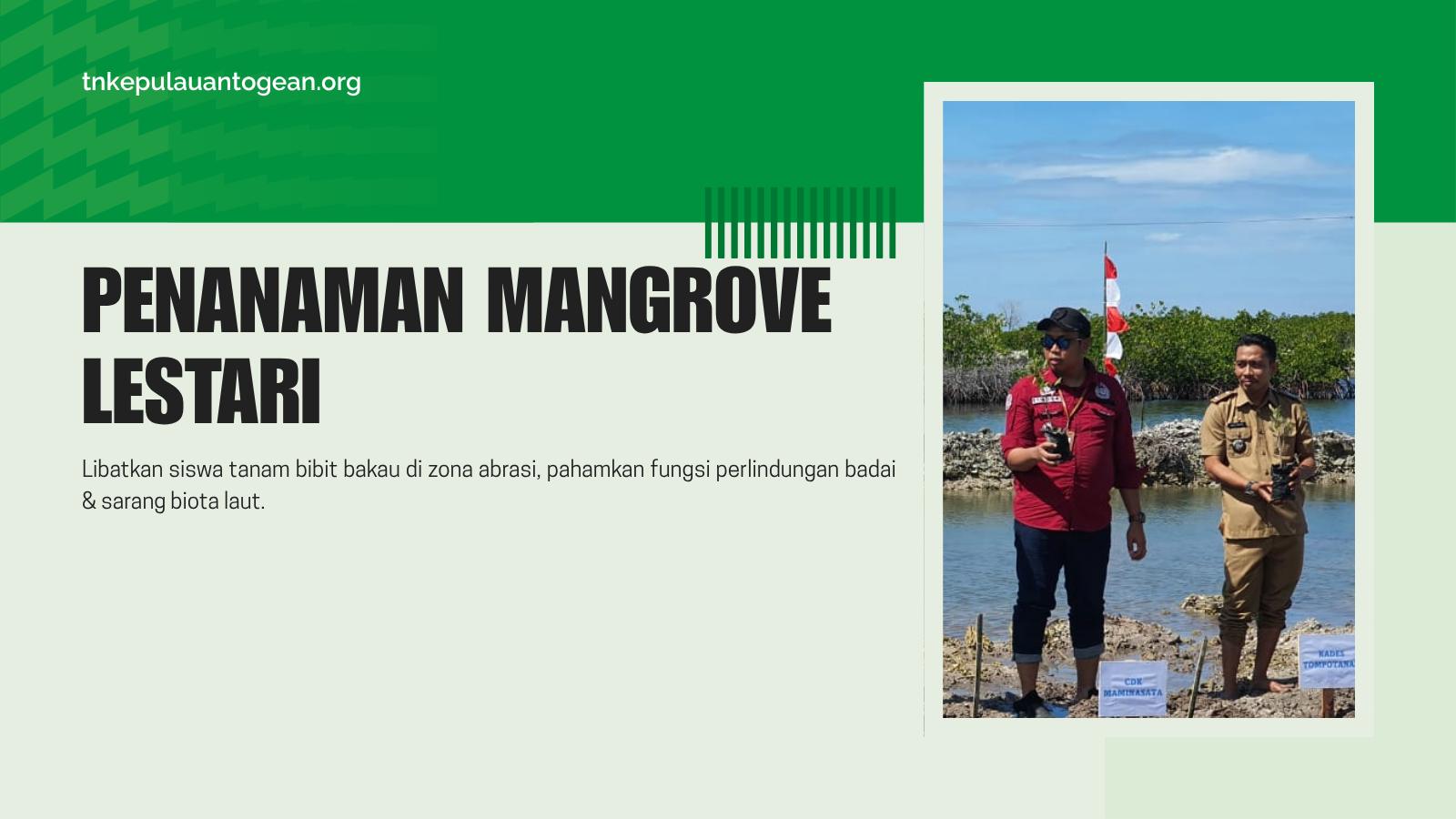 Libatkan siswa tanam bibit bakau di zona abrasi, pahamkan fungsi perlindungan badai & sarang biota laut.