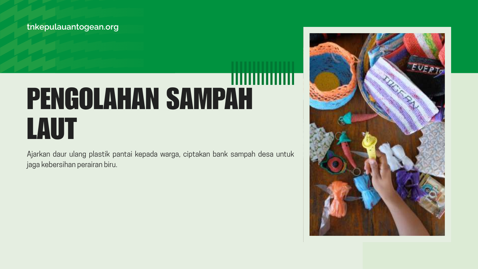 Ajarkan daur ulang plastik pantai kepada warga, ciptakan bank sampah desa untuk jaga kebersihan perairan biru.