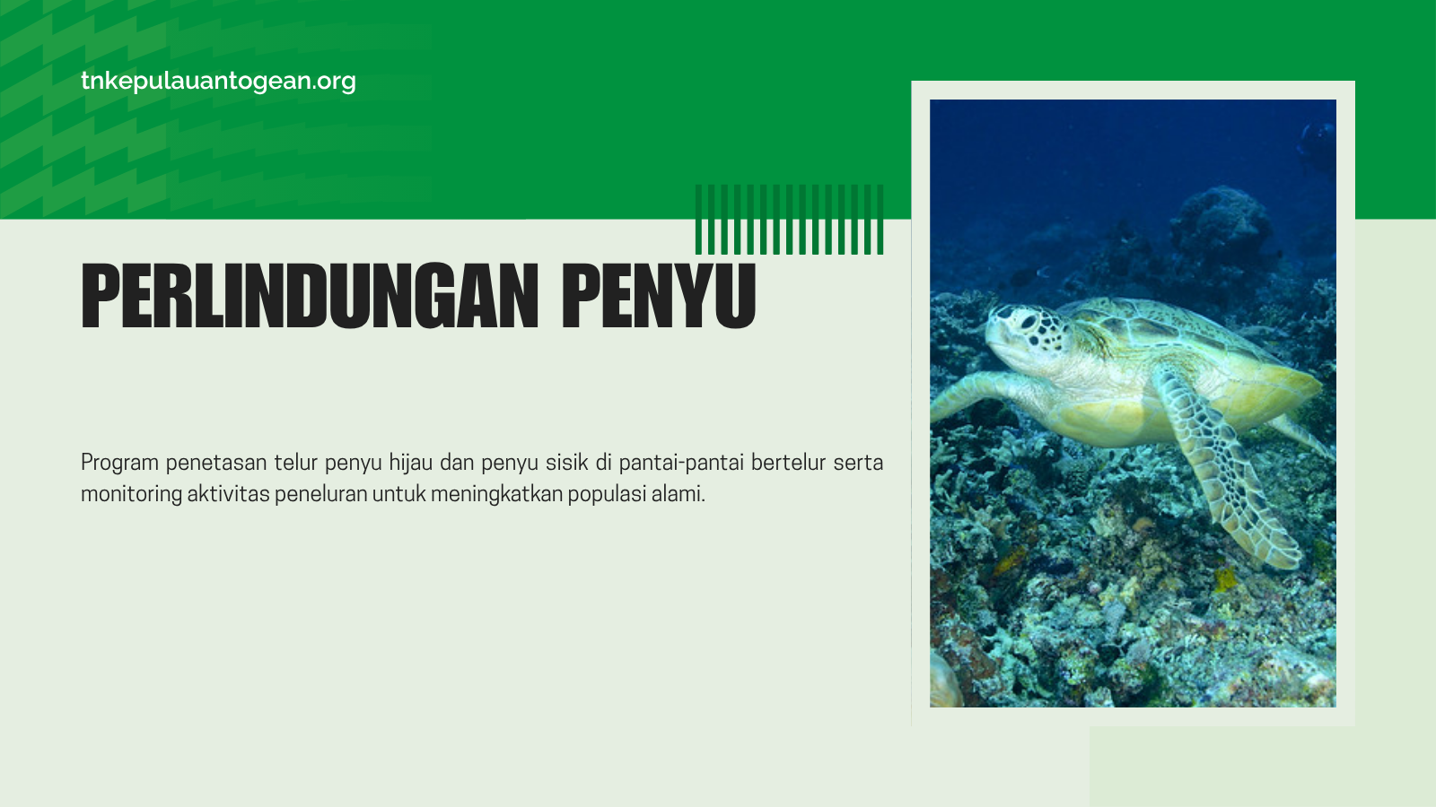 Program penetasan telur penyu hijau dan penyu sisik di pantai-pantai bertelur serta monitoring aktivitas peneluran untuk meningkatkan populasi alami.